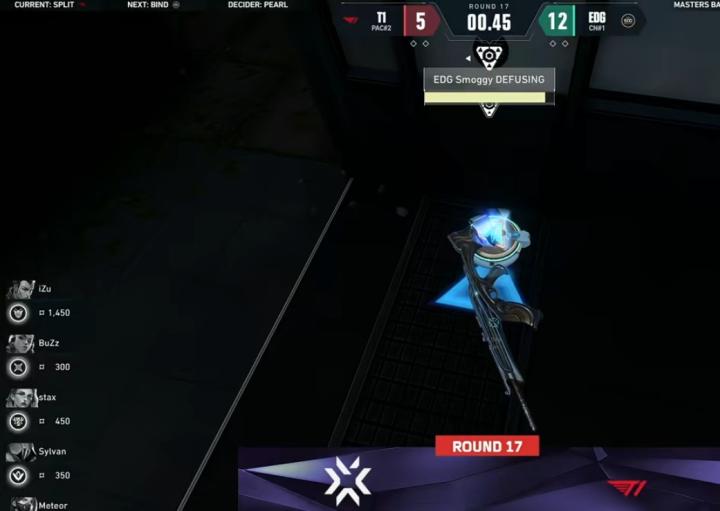 第17回合,T1继续打A,Smoggy打赢1v1斗牛但时间不够(0.45秒)拆包,12-5。EDG叫出暂停。