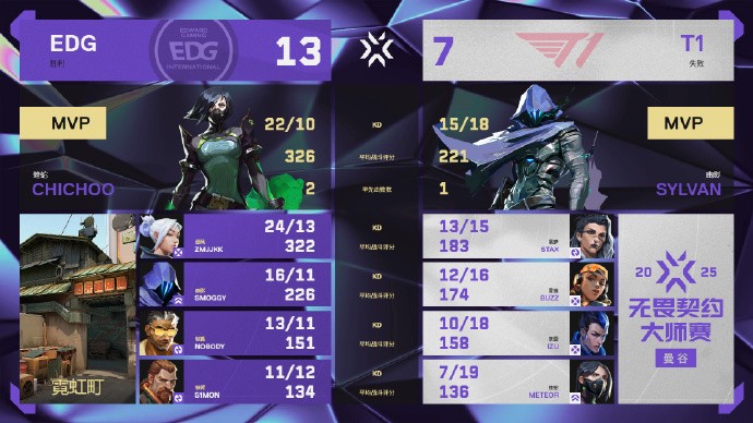 北京时间2月27日,无畏契约曼谷大师赛淘汰赛,EDG在霓虹町中13-7力克T1,暴打对手选图,暂1-0领先。