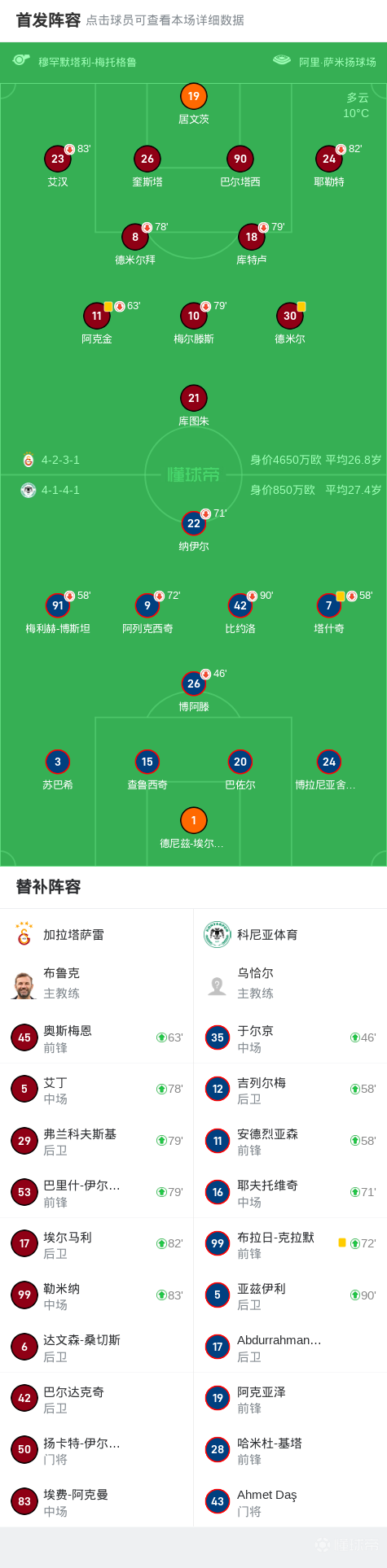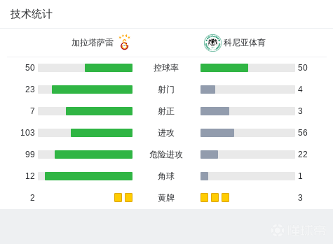 加拉塔萨雷0-0科尼亚体育,梅尔滕斯、库图朱造险战报bot @懂球帝2025-02-28 02:00北京时间2月28日土耳其杯小组赛第3轮,加拉塔萨雷对阵科尼亚体育。最终比分加拉塔萨雷 0-0 科尼亚体育。点击查看本场比赛详细数据>>点击查看土杯完整积分榜>>球队阵容技术统计展开更多