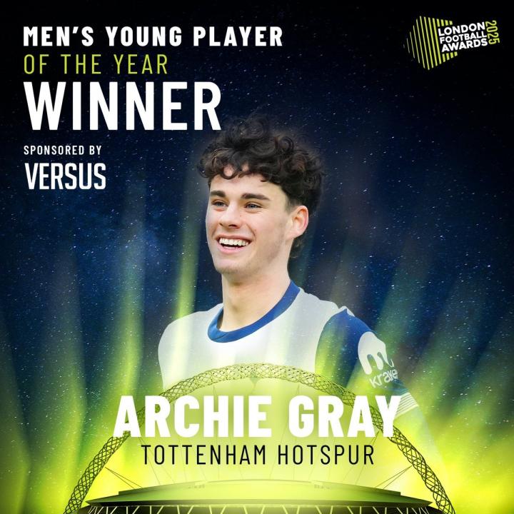 18岁热刺后卫阿奇-格雷当选2025年伦敦足球奖年度最佳男足年轻球员,他在评选中击败了恩瓦内里(阿森纳)、刘易斯-斯凯利(阿森纳)、埃塞(水晶宫)和罗科-瓦塔(沃特福德)。