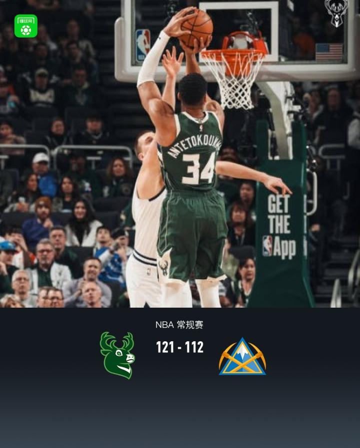 第四节雄鹿字母哥拿下9分,掘金贾马尔-穆雷拿下9分,最终雄鹿121-112战胜掘金