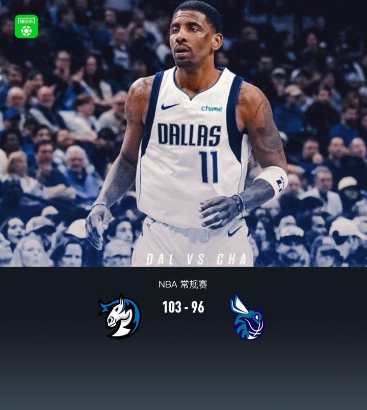 北京时间2月28日NBA常规赛,半场独行侠50-49黄蜂,最终独行侠103-96黄蜂。