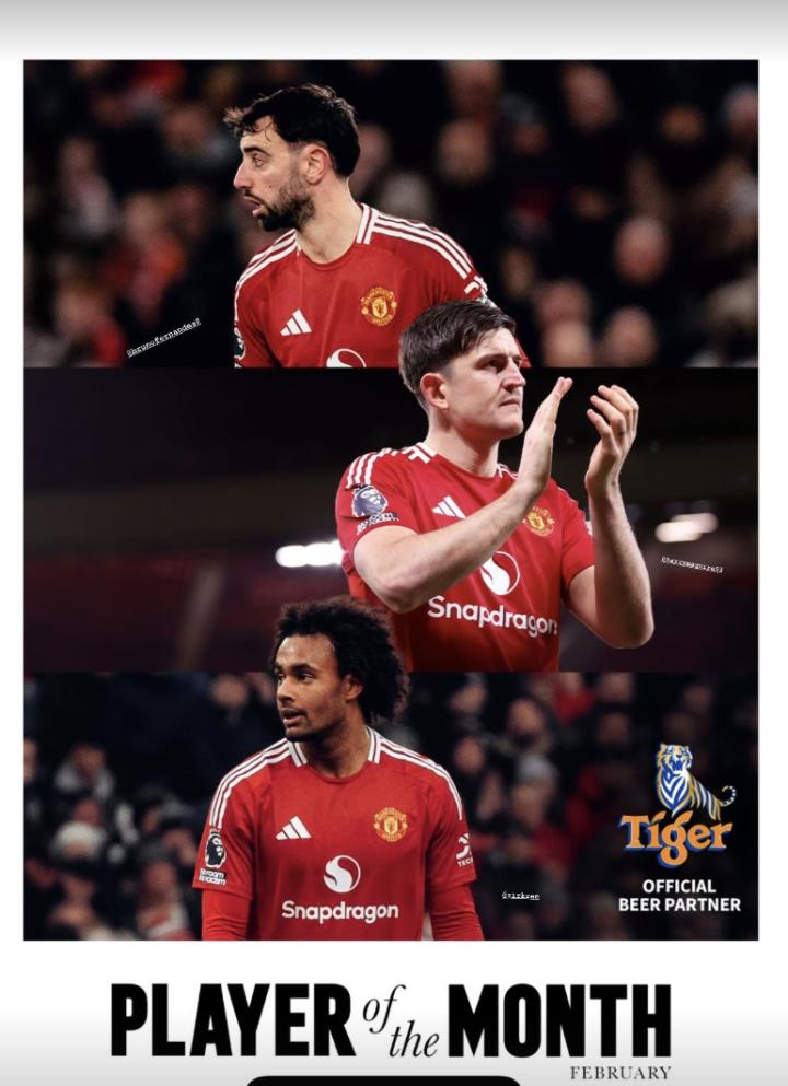 官方消息,曼联2月最佳球员候选名单公布,分别是马奎尔、布鲁诺-费尔南德斯和齐尔克泽。