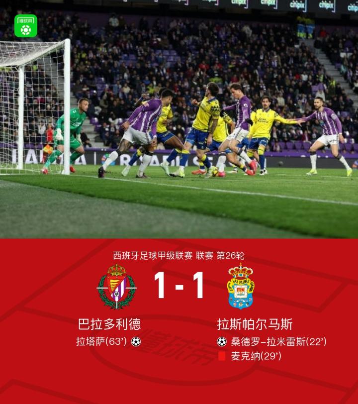巴拉多利德1-1十人拉斯帕尔马斯,拉米雷斯、拉塔萨破门。麦克纳染红