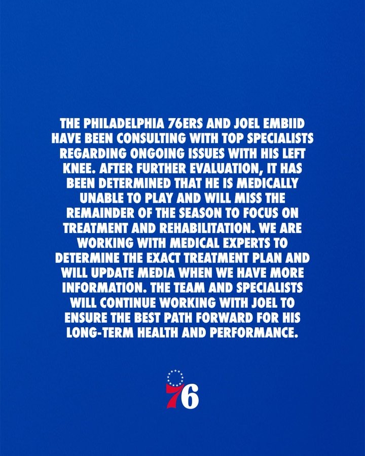 我们与乔尔一直就他的左膝伤情持续咨询顶级专家,经过进一步评估,已经确定他因身体原因无法参加比赛,他将缺席本赛季剩余比赛,并专注于康复治疗。