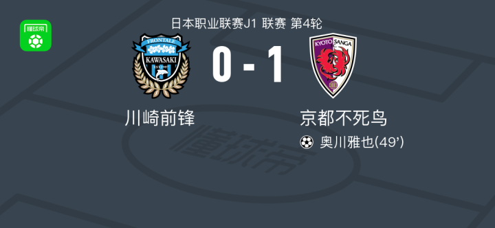 北京时间3月1日日本职业联赛J1 联赛 第4轮,川崎前锋主场对阵京都不死鸟。京都不死鸟奥川雅也破门。最终比分川崎前锋 0-1 京都不死鸟。