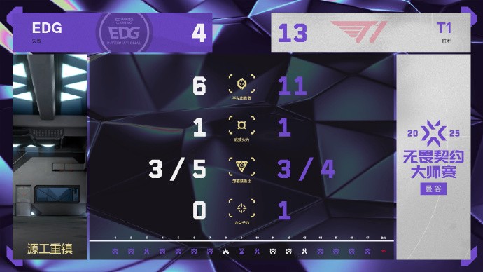 北京时间3月1日,无畏契约曼谷大师赛败者组决赛(BO5),T1开局火力全开,全员枪法在线,以13-4轻取图一,EDG暂0-1落后。