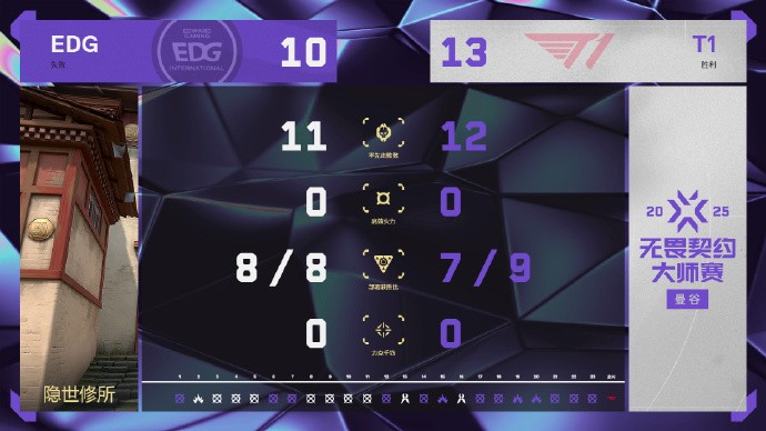 北京时间3月1日,无畏契约曼谷大师赛败者组决赛(BO5),在图二隐世修所中,T1展示出强大的韧性,下半场连得7分逆转取胜,EDG暂0-2落后,命悬一线。