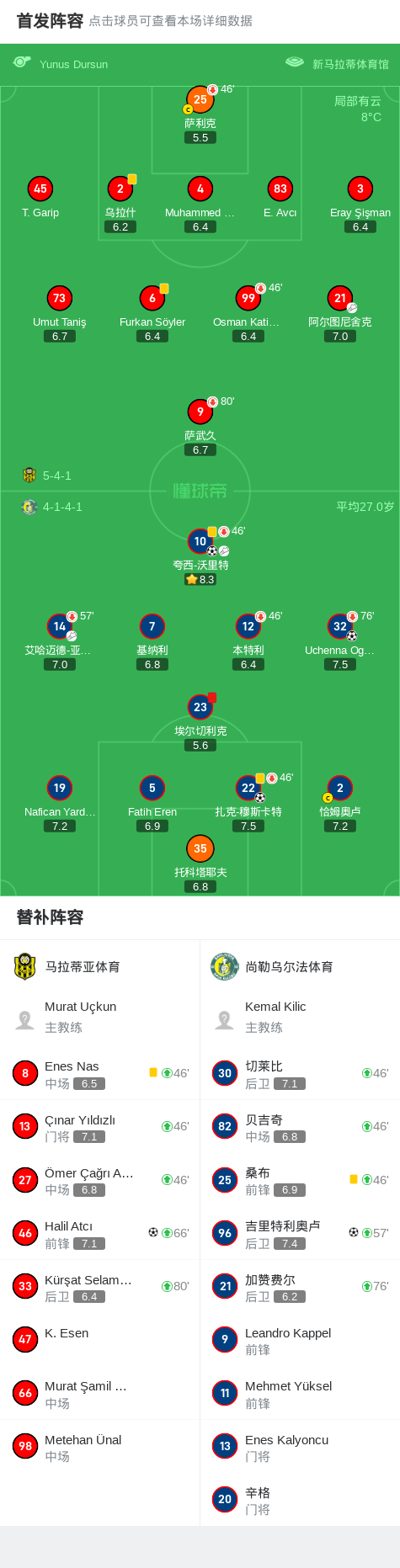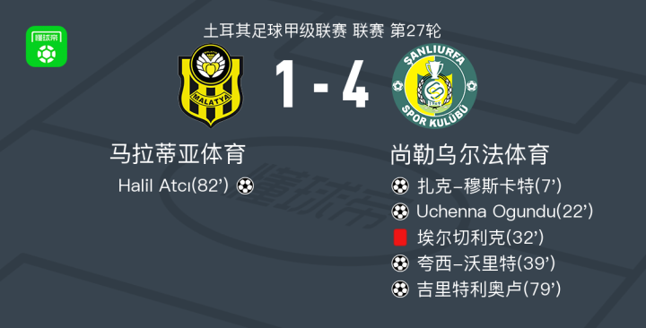 尚勒乌尔法体育4-1大胜马拉蒂亚体育 ,吉里特利奥卢破门,夸西-沃里特1传1射