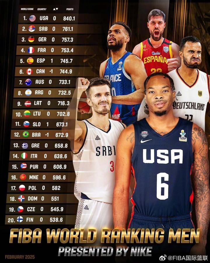 国际篮联官方更新最新一期男篮世界排名,美国男篮稳居榜首,中国队继续排在世界第30位,亚大区排名第6。