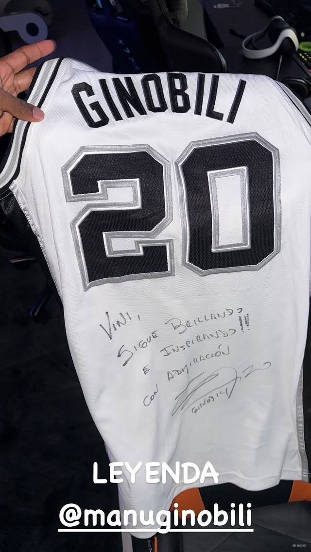 除了在皇马取得的辉煌成就,维尼修斯还在社交媒体上展示了他最新收到的珍贵礼物——一件由NBA传奇球星马努-吉诺比利亲笔签名的圣安东尼奥马刺队球衣。