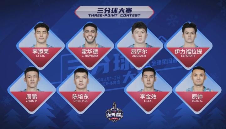 北京时间3月1日,CBA全明星三分大赛预赛,共8人参赛,原帅(山西)、陈培东(山东)、伊力福拉提·莫合坦尔(新疆)、李添荣(上海)、李金效(四川)、周鹏(深圳)、乔丹·霍华德(宁波)、昂萨尔(特邀大学生球员)。最终原帅、周鹏、陈培东晋级明日决赛。