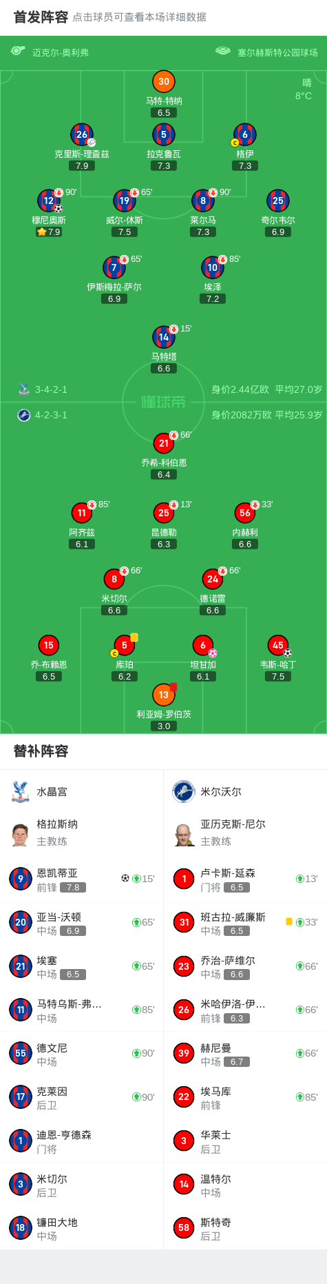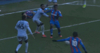 第33分钟,坦甘加头球解围不慎将球顶进自家球门,水晶宫1-0