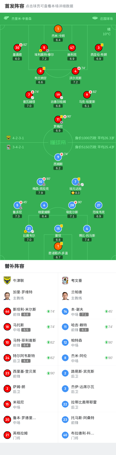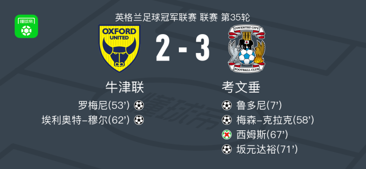 北京时间3月1日,英格兰足球冠军联赛第35轮,牛津联主场迎战考文垂。比赛中,考文垂率先取得领先,坂元达裕助攻鲁多尼成功破门。随后,牛津联展开反击,罗梅尼接队友助攻扳回一城。不久后,考文垂再度扩大优势,梅森-克拉克为球队再添一分。牛津联并未放弃,埃利奥特-穆尔在古德尔哈姆的助攻下再度缩小分差。然而,考文垂在之后的比赛中由坂元达裕再入一球,锁定胜局。尽管考文垂曾错失一次点球机会,但这并未影响最终结果。全场比赛结束,牛津联2-3不敌考文垂。