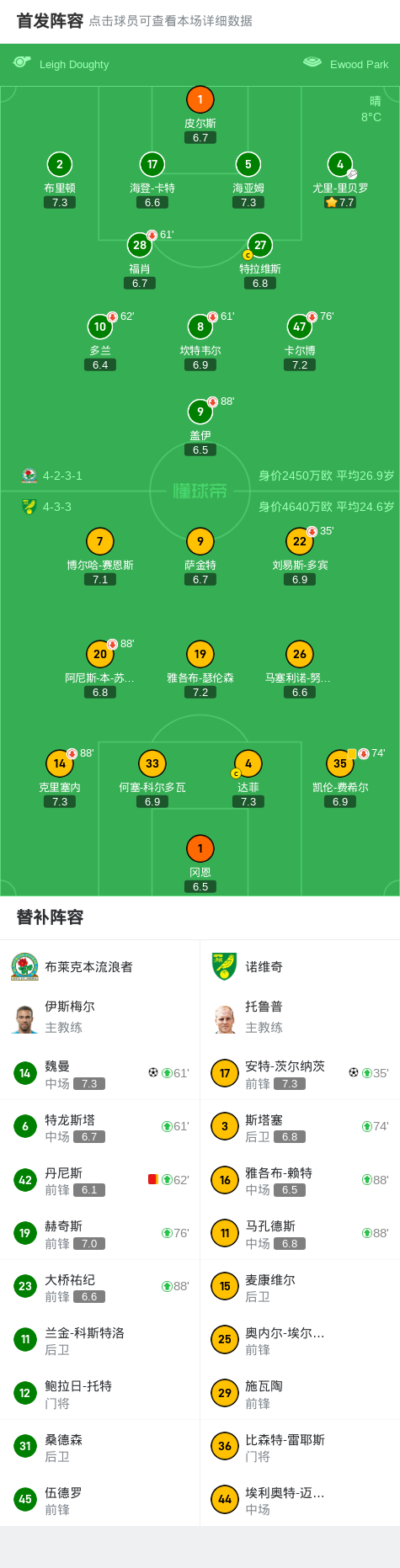 北京时间3月1日,英格兰足球冠军联赛第35轮,布莱克本流浪者主场迎战诺维奇。比赛中,布莱克本流浪者的丹尼斯因累积两张黄牌被罚离场。随后,诺维奇由安特-茨尔纳茨打破僵局,取得领先。比赛进入补时阶段,布莱克本流浪者凭借尤里-里贝罗的助攻,由魏曼扳平比分。最终,双方以1-1握手言和。