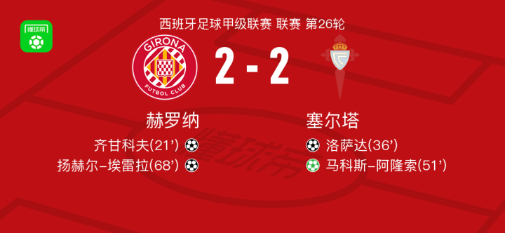 北京时间3月1日,西班牙足球甲级联赛第26轮,赫罗纳主场迎战塞尔塔。比赛中,赫罗纳的齐甘科夫和扬赫尔-埃雷拉各入一球,为球队取得领先。塞尔塔方面,洛萨达和马科斯-阿隆索分别为球队建功,其中包括一粒点球。最终,双方以2-2握手言和。