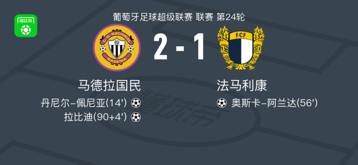 北京时间3月1日,葡萄牙足球超级联赛第24轮,马德拉国民主场迎战法马利康。比赛中,马德拉国民凭借丹尼尔-佩尼亚和拉比迪的进球两度取得领先。法马利康方面,奥斯卡-阿兰达为球队扳回一城。最终,马德拉国民以2-1战胜法马利康,全取三分。