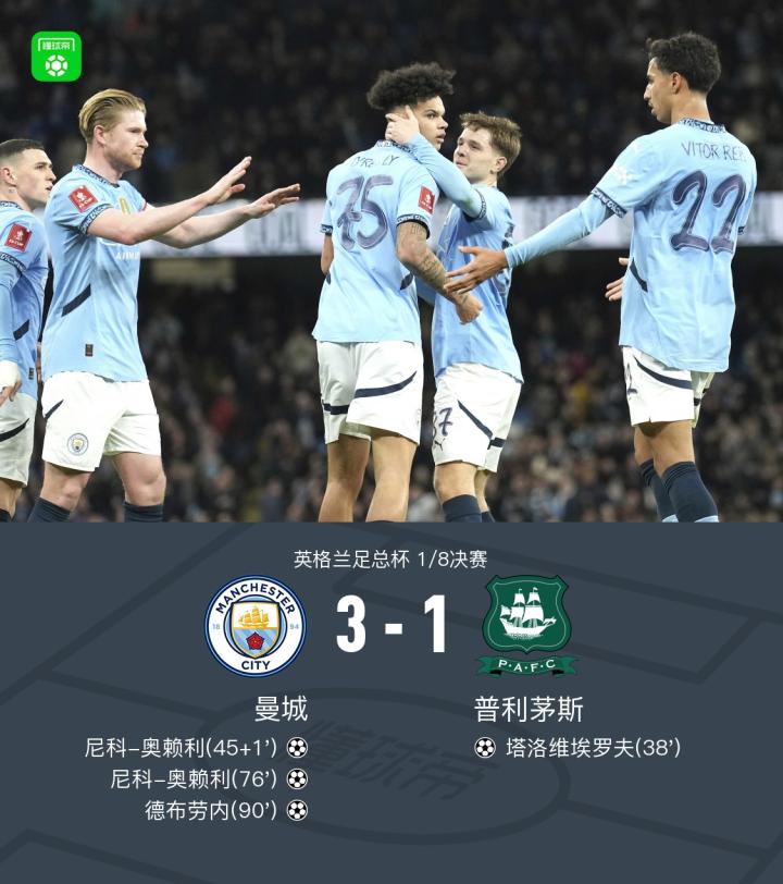 足总杯曼城3-1普利茅斯晋级8强,德布劳内传射,奥赖利双响