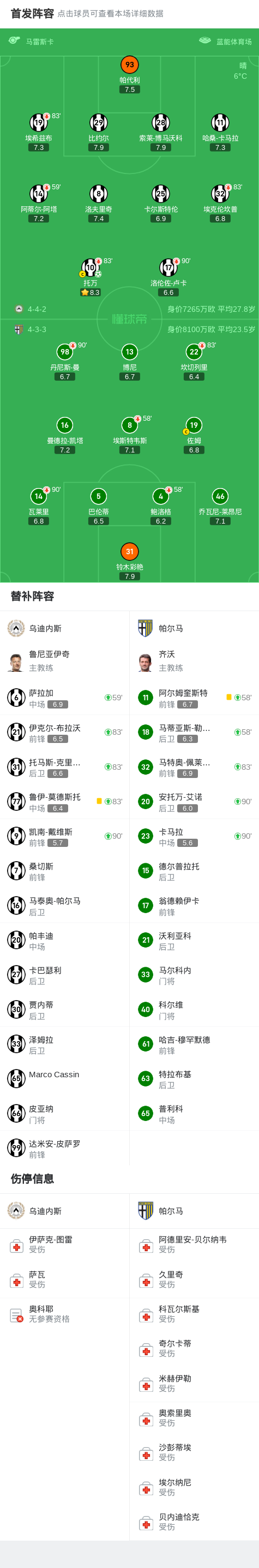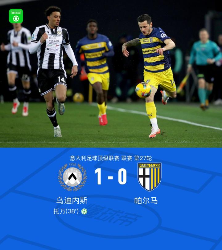 乌迪内斯1-0帕尔马,托万点射制胜战报bot @懂球帝2025-03-02 05:54北京时间3月2日,意大利足球甲级联赛第27轮,乌迪内斯主场迎战帕尔马。比赛中,乌迪内斯球员托万成功罚入点球,为球队打破僵局。最终,乌迪内斯以1-0战胜帕尔马,全取三分。点击查看本场比赛详细数据>>点击查看意甲完整积分榜>>精彩瞬间第38分钟,乌迪内斯球员托万罚入点球。 球队阵容 技术统计 展开更多