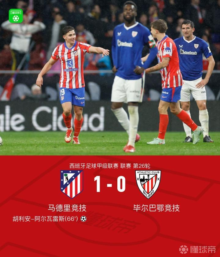第66分钟,阿尔瓦雷斯破门,打破场上僵局,马竞1-0毕包