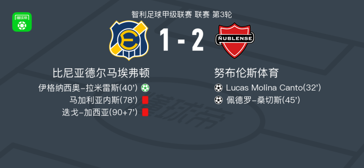 北京时间3月2日,智利足球甲级联赛第3轮,比尼亚德尔马埃弗顿主场迎战努布伦斯体育。比赛中,努布伦斯体育的Lucas Molina Canto率先打破僵局,随后伊格纳西奥-拉米雷斯为比尼亚德尔马埃弗顿罚入点球扳平比分。不久后,佩德罗-桑切斯再度帮助努布伦斯体育取得领先。比赛尾声阶段,比尼亚德尔马埃弗顿有两名球员被红牌罚下,最终未能改写比分。全场比赛结束,比尼亚德尔马埃弗顿以1-2不敌努布伦斯体育。