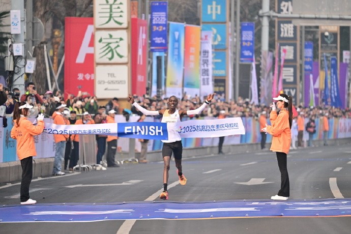 肯尼亚选手Boaz KIPKEMEI率先冲过终点线,夺得2025重庆马拉松冠军,并且打破赛会纪录。成绩2小时07分18秒左右。
