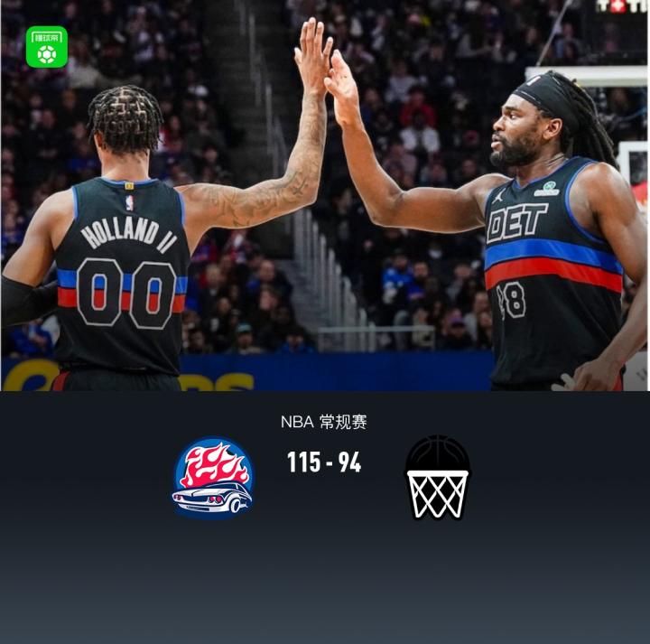 活塞115-94大胜篮网,杜伦18+11,坎宁安15+7+9