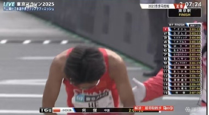 中国选手何杰成绩为2小时07分20秒,以个人第二好成绩完赛,排名第16位。