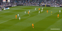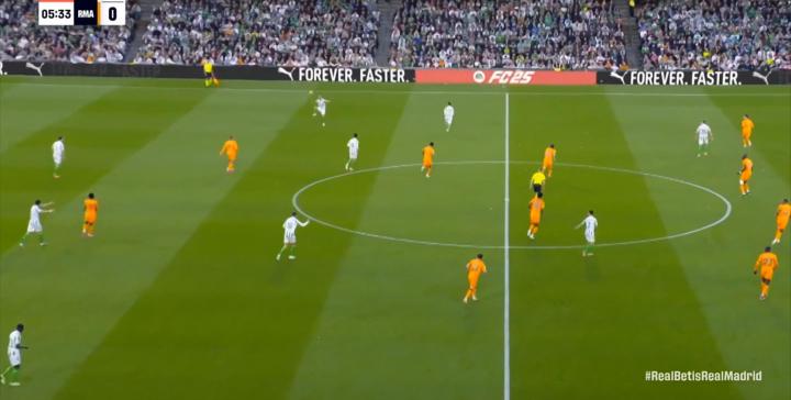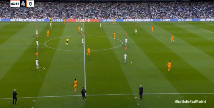 于是在第9分钟,皇马就已经打进了皇家贝蒂斯的两线之间,摸到了他们双中卫和双后腰之间的区域: