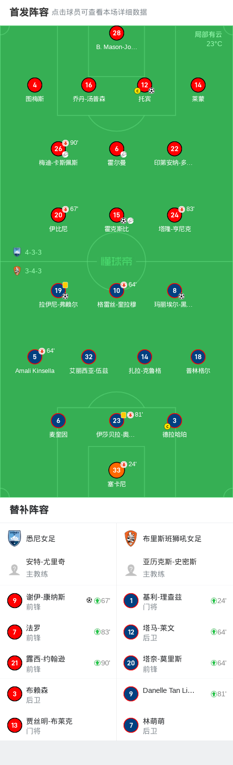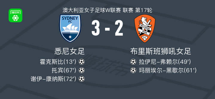 悉尼女足3-2布里斯班狮吼女足,谢伊-康纳斯破门,托宾建功