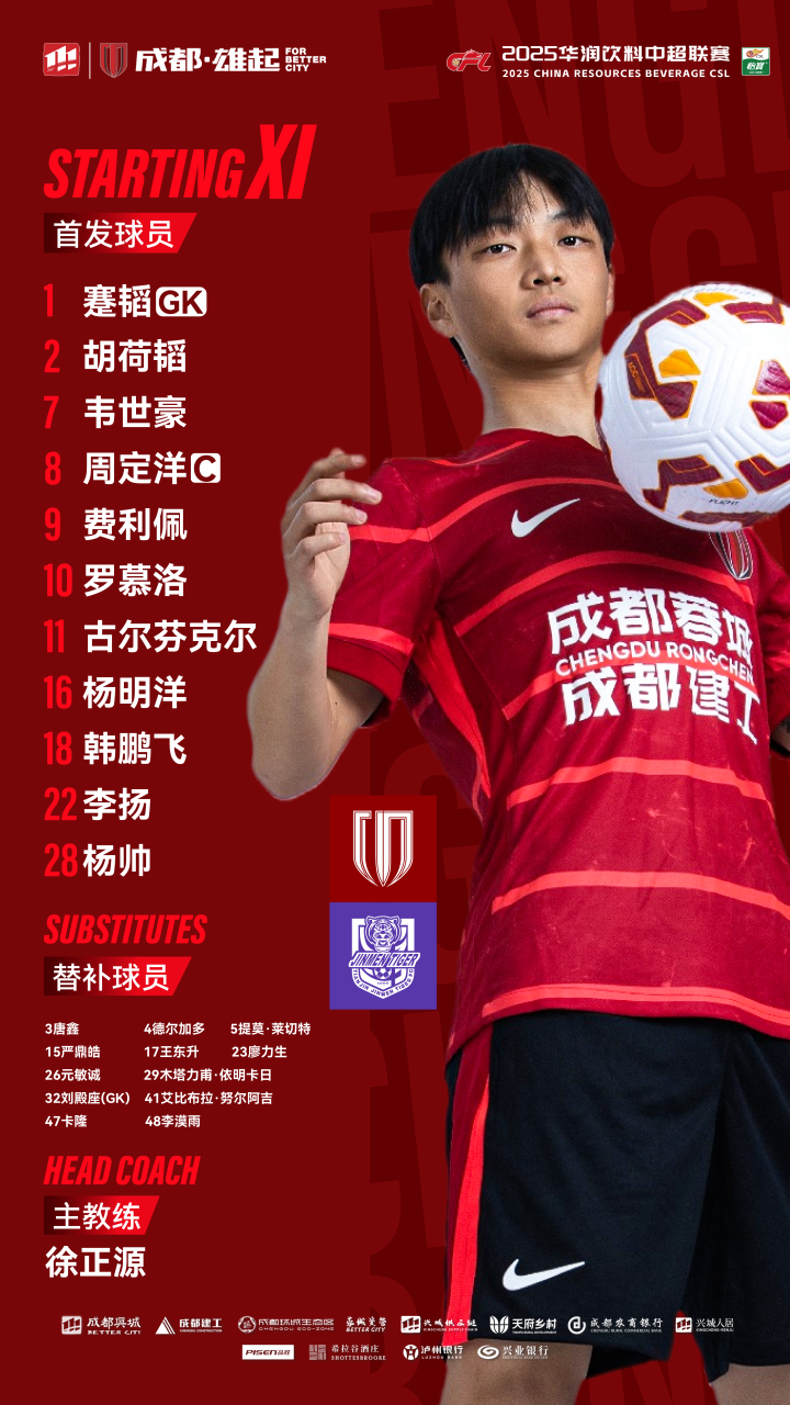 成都蓉城vs天津津门虎 比赛首发名单出炉! 成都,雄起!