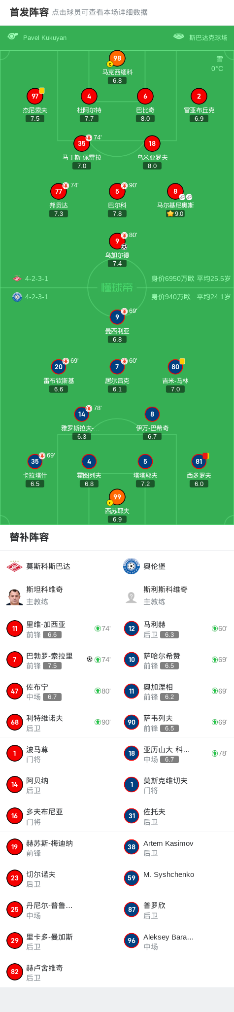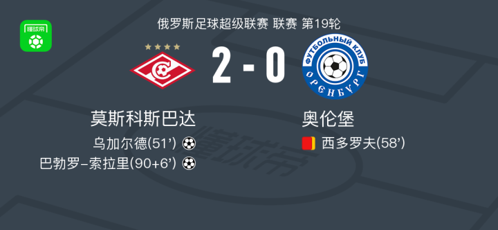 莫斯科斯巴达2-0奥伦堡加索维克,乌加尔德建功,巴勃罗-索拉里锁定胜局
