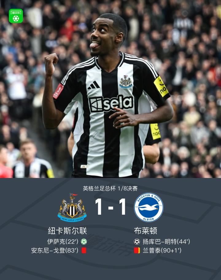在北京时间3月2日进行的英格兰足总杯1/8决赛中,纽卡斯尔联迎战布莱顿。比赛中,纽卡斯尔联凭借伊萨克罚入的点球取得领先。随后,布莱顿由扬库巴-明特扳平比分。比赛尾声阶段,戈登故意推人被红牌罚下,随后兰普泰也在补时阶段因累计两张黄牌被罚出场。常规时间内双方1-1握手言和,比赛进入加时赛。