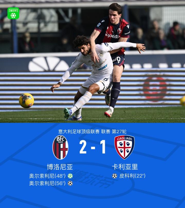 北京时间3月2日,意大利足球甲级联赛第27轮,博洛尼亚主场迎战卡利亚里。比赛中,皮科利为客队首开纪录,随后博洛尼亚凭借奥尔索利尼的点球扳平比分。不久后,奥尔索利尼再入一球完成梅开二度,帮助球队反超。最终,博洛尼亚以2-1战胜卡利亚里。
