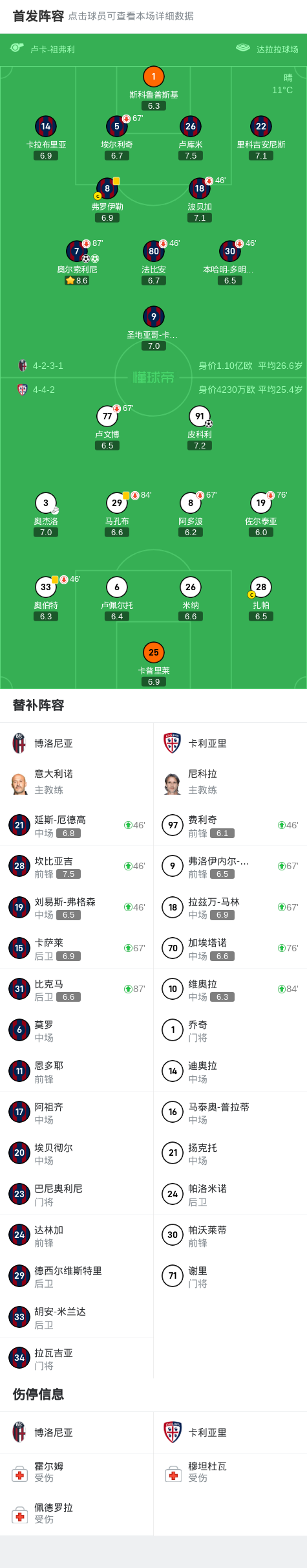 博洛尼亚2-1逆转卡利亚里,奥尔索利尼梅开二度