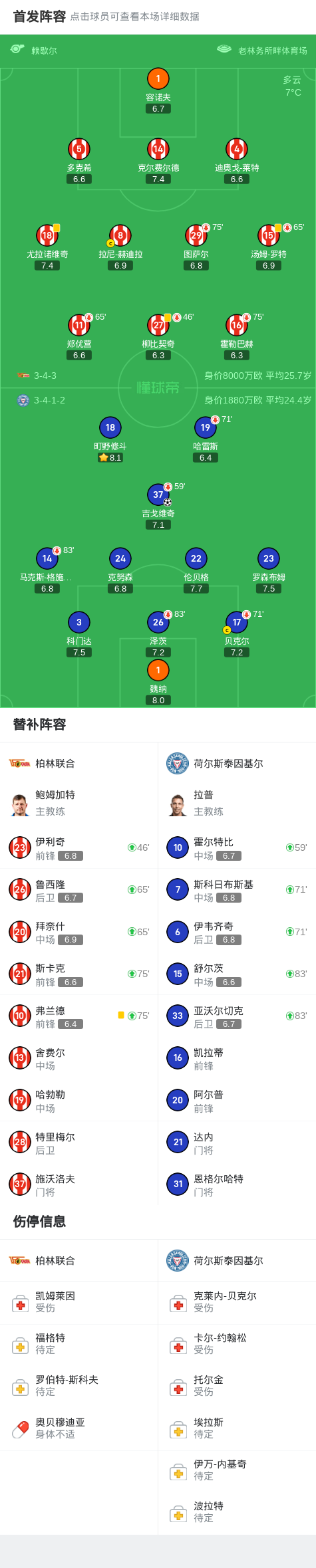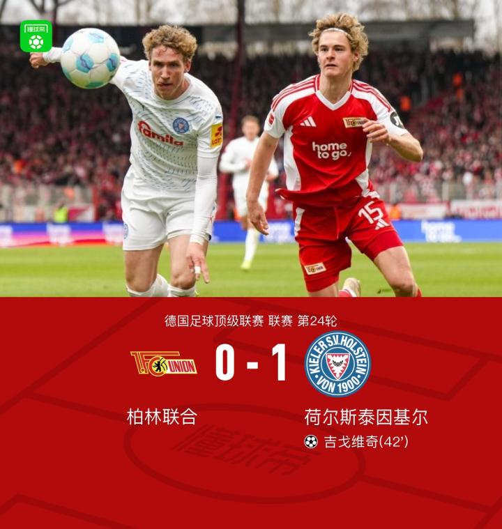 柏林联合0-1基尔,吉戈维奇一锤定音战报bot @懂球帝2025-03-03 00:27北京时间3月2日,德国足球甲级联赛第24轮,柏林联合主场迎战荷尔斯泰因基尔。比赛中,荷尔斯泰因基尔凭借吉戈维奇的进球取得领先。最终,柏林联合以0-1不敌荷尔斯泰因基尔。点击查看本场比赛详细数据>>点击查看德甲完整积分榜>>精彩瞬间第42分钟,荷尔斯泰因基尔球员吉戈维奇打入一球。 球队阵容 技术统计 展开更多