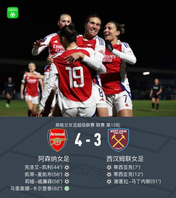 北京时间3月3日,英格兰女足超级联赛第15轮,阿森纳女足主场迎战西汉姆联女足。比赛中,双方球员表现出色,奉献了一场精彩的对决。 比赛开始后,西汉姆联女足迅速取得领先,蒂西亚克在短时间内连入两球,为球队奠定了优势。随后,谢基拉-马丁内斯再下一城,进一步扩大了领先优势。 然而,阿森纳女足并未因此气馁,她们在场上展现出顽强的斗志。马里奥娜-卡尔登泰助攻克洛艾-凯利扳回一城,随后凯蒂-麦凯布和莉娅-威廉森相继破门,将比分追平。关键时刻,马里奥娜-卡尔登泰罚入点球,帮助阿森纳女足实现反超。 最终,阿森纳女足以4比3战胜西汉姆联女足,赢得了这场激动人心的比赛。