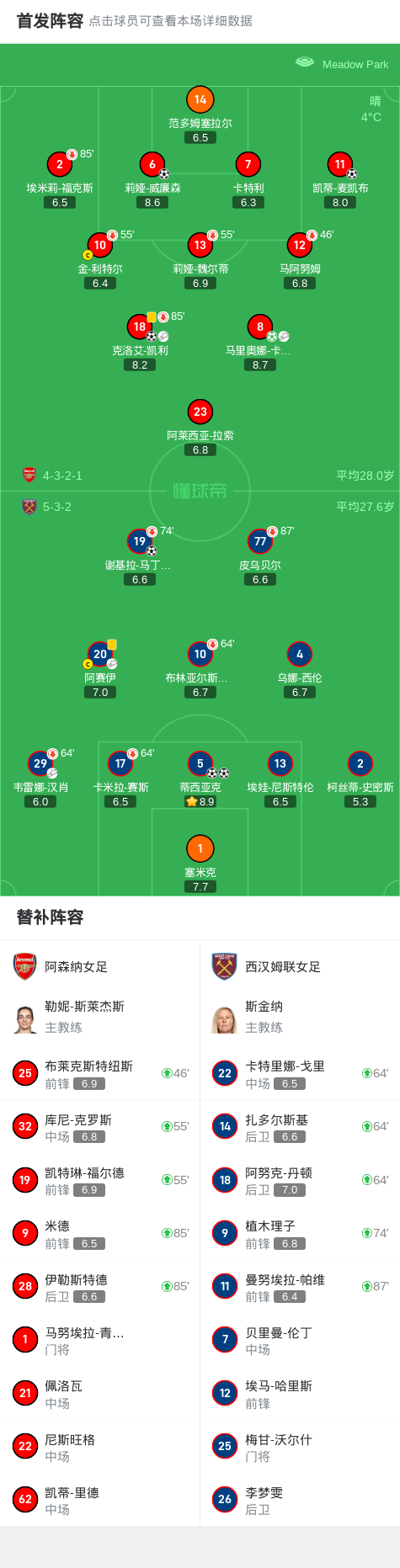阿森纳女足4-3西汉姆联女足,李梦雯替补未出战