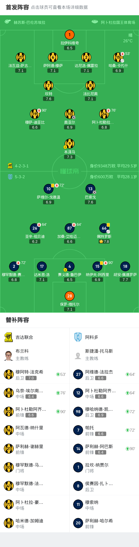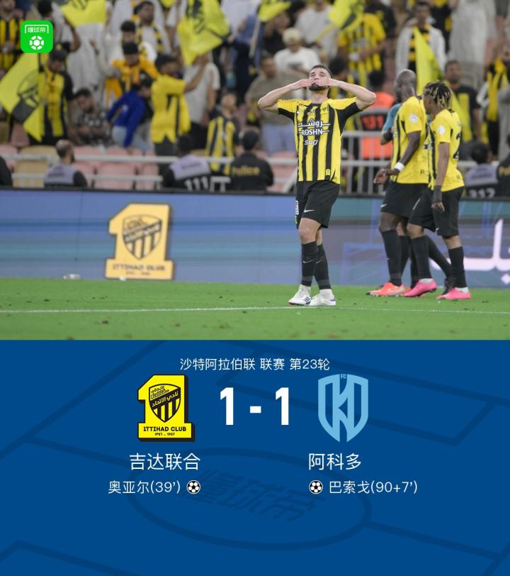 吉达联合1-1阿科多,奥亚尔首开纪录,巴索戈补时绝平