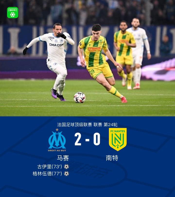 北京时间3月3日,法国足球顶级联赛第24轮,马赛主场迎战南特。比赛中,马赛凭借古伊里和格林伍德的进球,成功取得两球领先。最终,马赛以2-0战胜南特,全取三分。