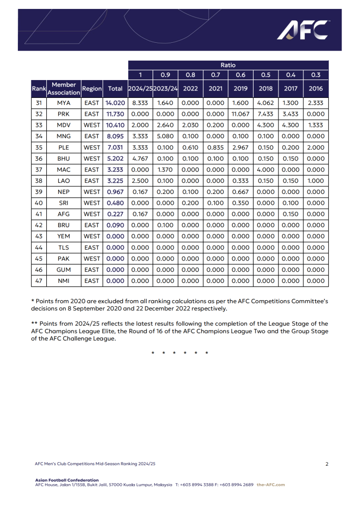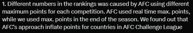 1. 排名数据不同的原因在于亚足联为每项赛事设定的最高积分不同。亚足联使用的是实时最高积分,而我们使用的是赛季结束时的最高积分。我们发现,亚足联的计算方式会导致亚冠挑战联赛(AFC Challenge League)所在国家的积分被人为抬高。
