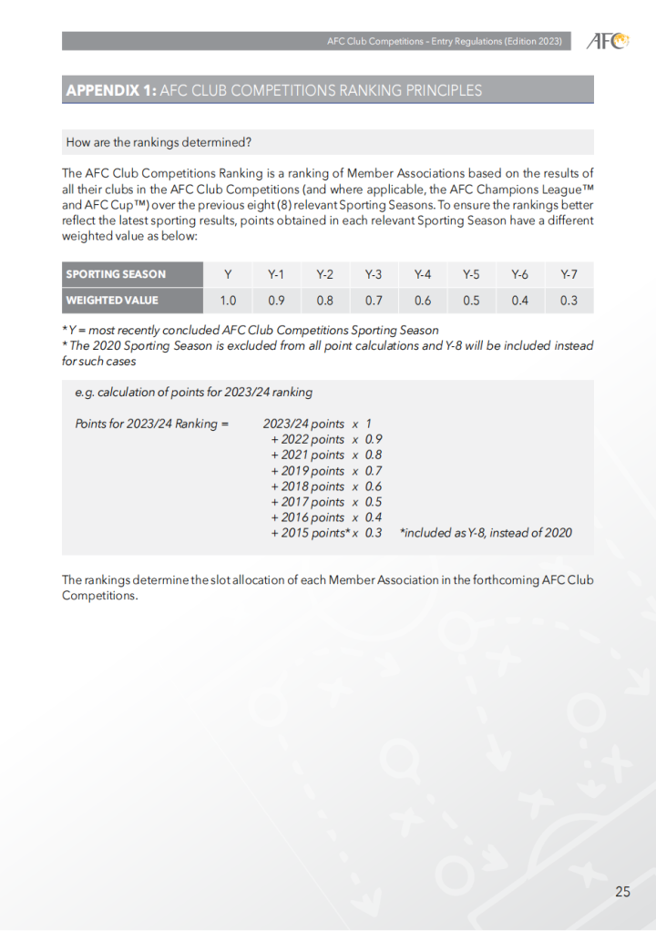 亚足联俱乐部赛事排名是基于各会员协会在亚足联俱乐部赛事(以及适用情况下,亚冠联赛和亚足联杯)中的所有俱乐部成绩,计算过去8个赛季的积分所得。为了使排名更好地反映最新的竞技结果,每个相关竞技赛季的积分按照以下不同的权重计算: