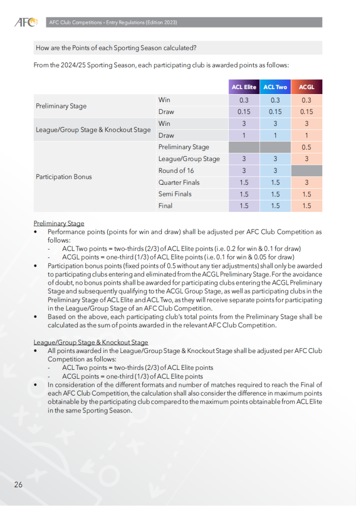 • 所有在联赛/小组赛&淘汰赛阶段获得的积分,将根据亚足联俱乐部赛事进行调整,具体如下: