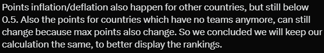 积分的膨胀/缩减现象在其他国家也存在,但幅度都在0.5分以内。此外,即使某些国家的球队已经全部被淘汰,由于最高积分仍在变化,它们的积分仍可能发生变化。因此,我们决定继续保持我们的计算方式,以更好地展示排名。