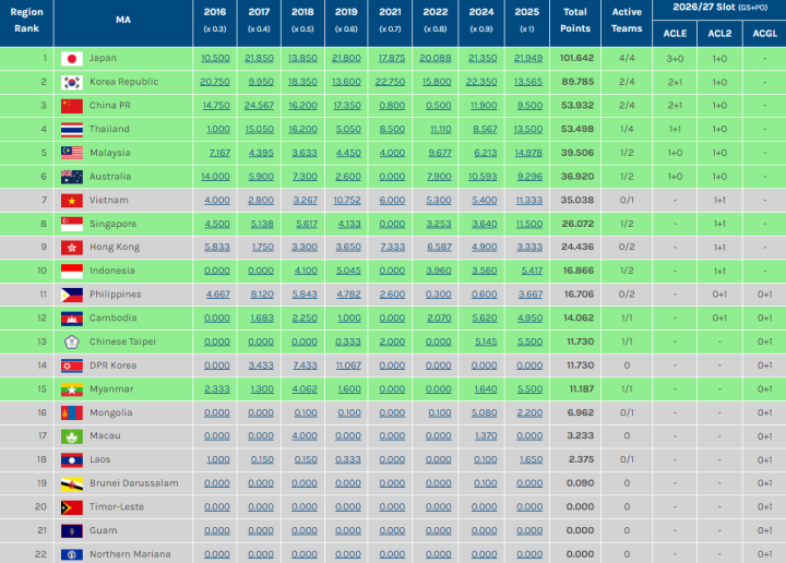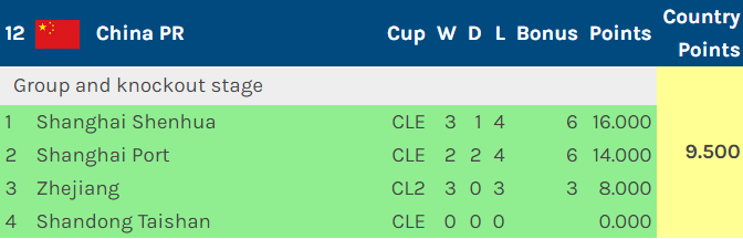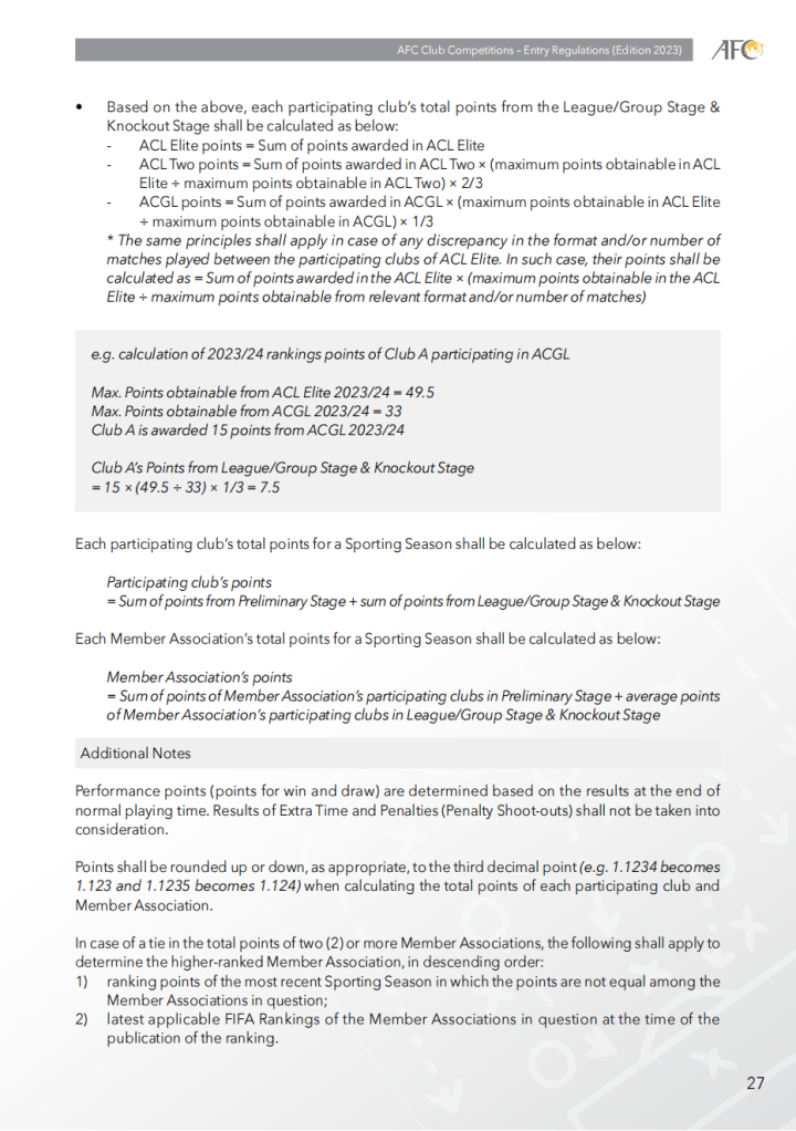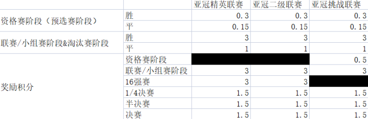 • 奖励积分(固定 0.5 分,无等级调整)仅授予参加并被淘汰出亚冠挑战联赛预选赛阶段的俱乐部。为避免歧义,以下情况不会获得参与奖励积分:参加亚冠挑战联赛 预选赛阶段并晋级亚冠挑战联赛 小组赛的俱乐部;参加亚冠精英联赛和亚冠二级联赛 预选赛阶段的俱乐部,因为他们将因进入联赛/小组赛而获得单独的积分。