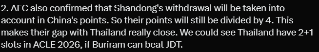 2. 亚足联还确认,山东泰山的退赛将计入中国的积分计算中。因此,中国的积分仍将除以4。(笔者注:重点!重点!重点!)这使得中国与泰国之间的积分差距非常接近。如果武里南联能击败柔佛DT,我们可能会看到泰国在2026赛季亚冠精英联赛(ACLE)中获得2+1的席位。