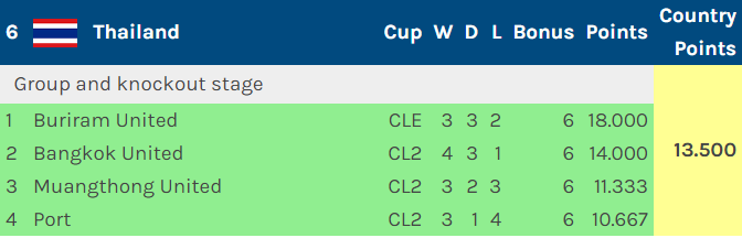 按照亚足联公布的积分,中国和泰国的积分差距是0.768分;但是考虑到泰国俱乐部在亚冠二级联赛均进入淘汰赛16强赛(尽管均无缘1/4决赛),以及目前AFC公布的积分对于所有参加亚冠二级联赛的球队均乘30/31.5,然后在乘2/3来处理(赛季结束之后只有乘2/3)。所以如果按照赛季结束时的最高积分计算,中国和泰国的积分差距仅有0.434分。东亚区的积分如下所示(来源于footy ranking的数据):