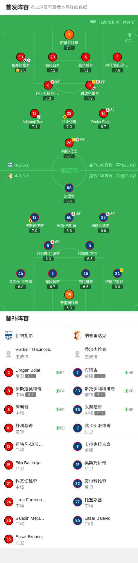 第23分钟,新帕扎尔球员拉基切维奇助攻维达科维奇打入一球。