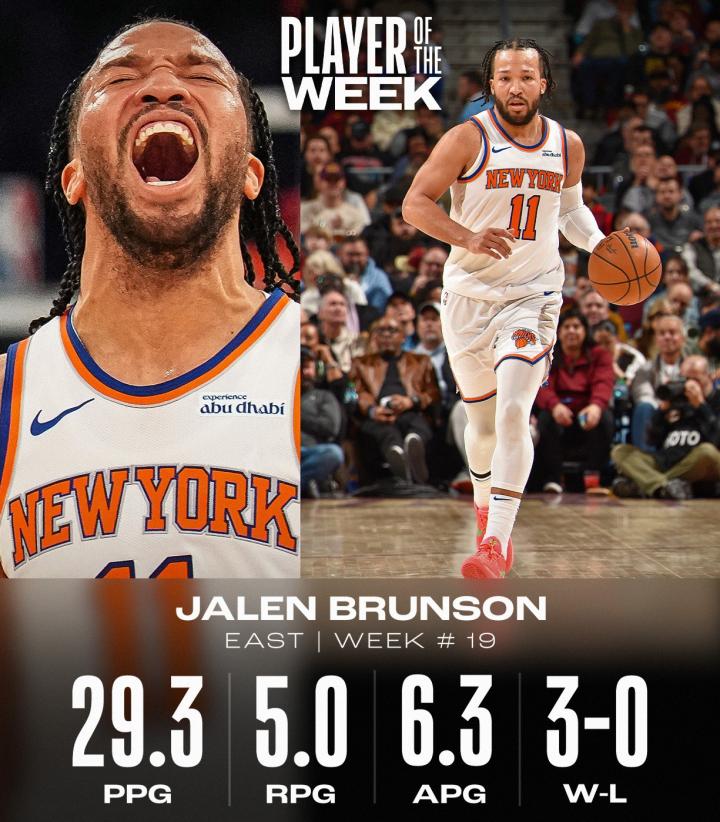 NBA官方:布伦森和拉文分别当选上周东、西部周最佳球员