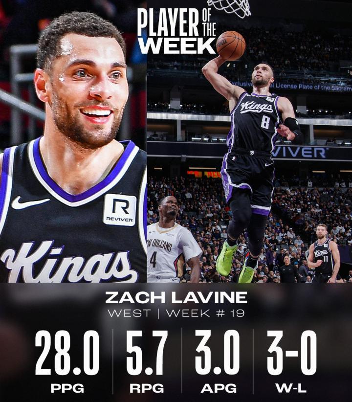 上周常规赛国王同样出战3场并且取得全胜,3场比赛拉文场均得到28分5.7篮板3助攻。